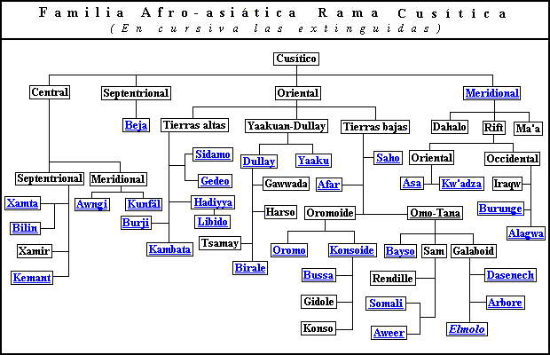 semítico etiópico. La lista mínima de lenguas grupos de lengua cusíticas