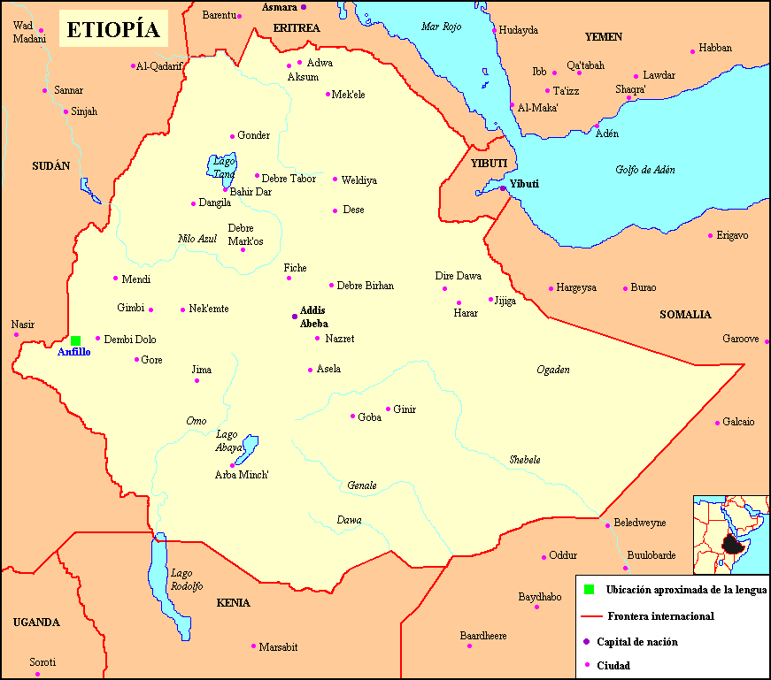 omótico septentrional. Es hablada por unas 500 personas de un grupo étnico de 1.000 que viven en el oeste de Etiopía en la región occidental de Dembi-Dolo la mayoría de los anfillo se han desplazado a la lengua oromo, que es cada vez más dominante en la zona desde el siglo XVI hasta ahora.