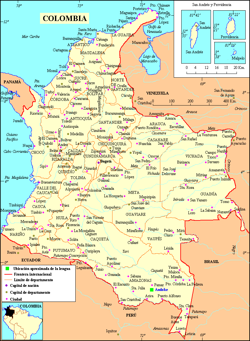 La lengua andoke (andoque) se habla en el río Aduche, afluente del Caquetá, en el departamento de Amazonas, en Colombia, y tal vez Perú. Los andoke son uno de los pocos grupos supervivientes del complejo cultural de la Amazonia entre los ríos Caquetá y Putumayo. Al principio del siglo XX eran 10.000 personas, pero fueron masacrados por la compañía extractora de caucho Casa Arana con sede en Iquitos. Aunque los niños hablan cada vez más español, el orgullo étnico y la apreciación de su tradición es muy fuerte entre los andoke. Con unos 520 miembros en el grupo étnico la lengua está amenazada. Se ha ubicado dentro de las macro-caribe o bien dentro de la macro-huitoto, pero ahora se considera lengua aislada.