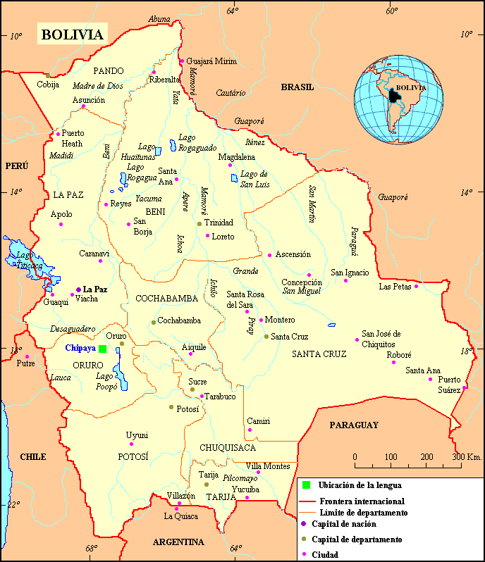 La lengua chipaya se habla en el departamento boliviano de Oruro, en la provincia de Atahuallpa, en Santa Ana de Chipaya y Ayparavi. Los chipaya tienen un complejo mundo religioso en el que los rituales juegan un papel central. Hay unos 1.200 hablantes de un grupo étnico de 1.800 personas. Está potencialmente amenazada. A pesar de los numerosos préstamos del aimara la lengua se mantienen en un nivel notable.