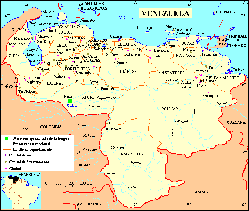 La lengua kuiva (cuiva, cuiba), se habla entre los ríos colombianos Meta, Casanare y Capanaparo, en la parte occidental del departamento de Arauca: Resguardo Los Iguanitos, municipalidad de Tame, bajo Cusay, al norte de Tame; en la parte noroccidental del departamento de Casanare: Resguardo Caño Mochuelo-Hato Corozal, en las municipalidades de Hato Corazal y Paz de Ariporo, entre la ciudad de Tame al norte y la de Paz de Ariporo al sur. En la parte noroccidental de Vichada: Resguardo Santa Teresita del Tuparro, municipalidad de Cumaribo hasta el noroeste de la parte central de la municipalidad de Cumaribo, entre los ríos Tomo y Vichada, a unos 200 Km. al oeste del Orinoco; en Resguardo La Pascua y las municipalidades de Puerto Carreño y Guacacías. La lengua está potencialmente amenazada con un grupo étnico de unas 2.275 personas que están localizadas principalmente en el departamento de Casanare. En Venezuela se habla en el estado de Apure, a lo largo del alto Capanaparo y su afluente Riecito. Los recolectores-cazadores cuiba viven en bandas seminómadas y la mayoría son monolingües. Hay aproximadamente 650 hablantes sobre un grupo étnico del mismo tamaño. Sin embargo, la lengua está amenazada debido a la reducción del grupo étnico.