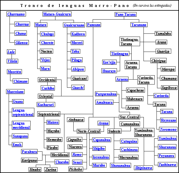 La familia pánoan (panoana, páno) consiste de 28 lenguas, 13 de ellas muertas, que se hablan en Brasil, Perú y Bolivia.