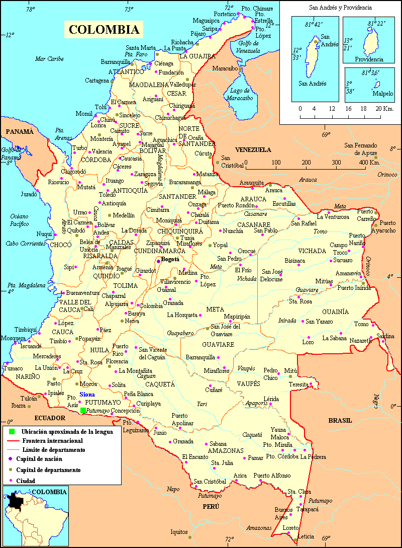 La lengua siona se habla en el departamento colombiano de Putumayo, en la frontera con Ecuador a lo largo del río Putumayo y sus afluentes, entre Poñuna Blanca y Poñuna Negra, en el Resguardo Buenavista y en El Tablero. Las enfermedades del hombre blanco y las atrocidades cometidas durante la etapa del caucho redujeron el número de los siona, viviendo la mayoría actualmente en el Resguardo Buenavista cerca de Puerto Asís. La lengua está amenazada con un grupo étnico de 700 personas. La lengua siona (pai coca, kokakañú) se habla a lo largo de los ríos ecuatorianos Shushufindi, Eno, Aguarico y Cuyabeno, en las comunidades de Biaña, Puerto Bolívar y Orawaya. Con 250 hablantes la lengua está seriamente amenazada.