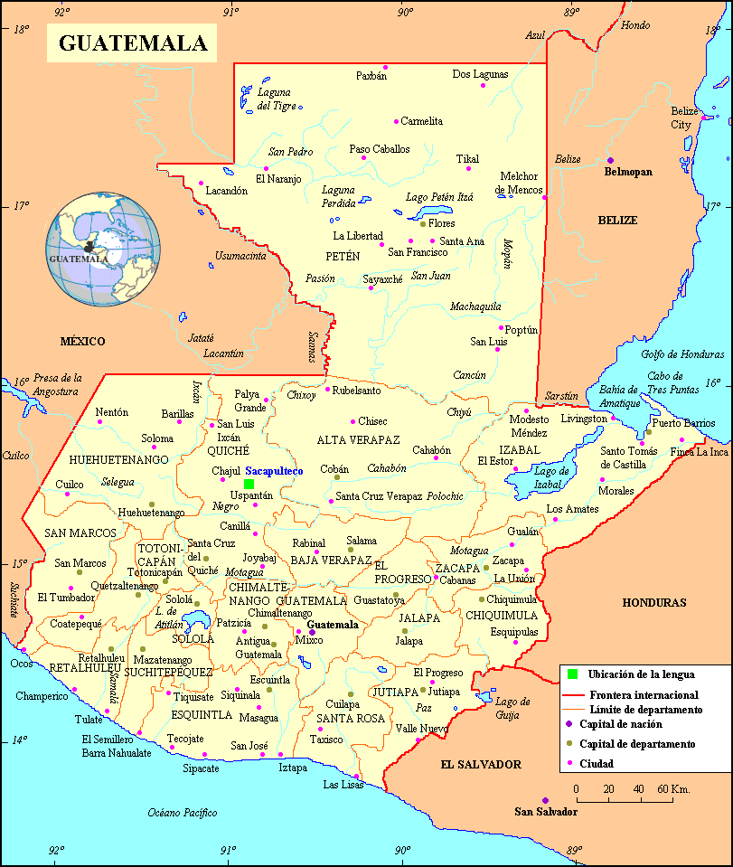 La lengua sacapulteco (puche) es hablada por 21.000 personas en Sacapulas, departamento de El Quiché, Guatemala.