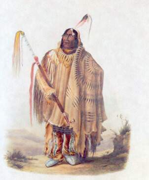 Retrato del jefe hidatsa Péhriska-Rúhpa, Dos Cuervos, hacia 1830 por Karl Bodmer.