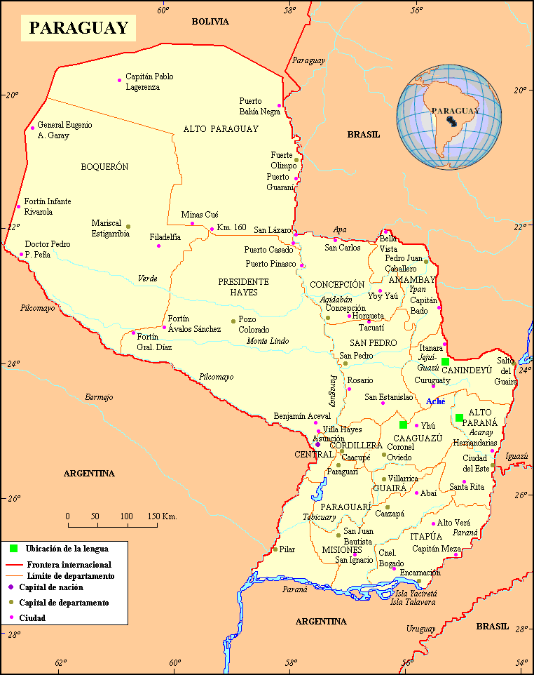 coloquial aunque todavía conservan su lengua. Están distribuidos en varias reservas en Paraguay: la de Cerro Morotï, en el distrito de San Joaquín, en el departamento de Caaguazú; en la reserva de Ypetimi (Cantina Cue) en el distrito de Abaí, en el departamento de Caazapá; en la reserva de San Alfred (Puerto Barra) en el distrito de Naranjal, en el departamento de Alto Paraná y en la reserva de Chupa Pou y Arroyo Bandera, en el distrito de Ygatymí, en el departamento de Canindeyú. Los aché son física y culturalmente distintos de otros grupos tupí-guaraní de la región, tal vez porque no son un grupo originalmente tupí sino uno distinto aunque asimilado. Hay unos 515 hablantes, por lo que la lengua está amenazada.