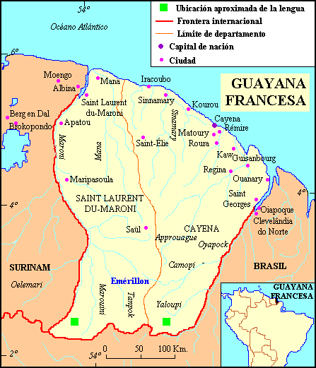 La lengua emérillon (teko) se habla en la frontera meridional de la Guayana Francesa, a lo largo del curso superior de los ríos Maroni y Oyapock. Los emérillon forman el único grupo étnico en la Guayana Francesa que no está representado en los países vecinos. A mediados del siglo XX estuvieron al borde de la extinción, pero ahora parecen estar recuperándose a nivel demográfico y lingüístico. Hay unos 400 miembros en el grupo étnico. La lengua está amenazada.