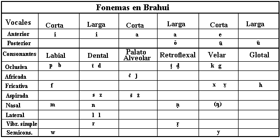 Existen 8 vocales en brahui y 28 consonantes.