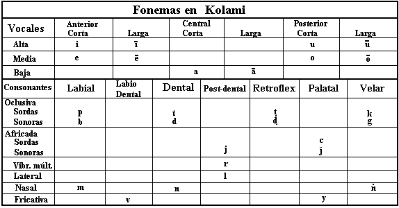 La lengua kolami tiene 10 vocales y 19 consonantes.