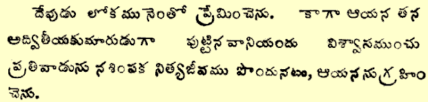 La figura inferior muestra un texto de la Biblia, Juan 3:16, en caracteres telugu y lengua