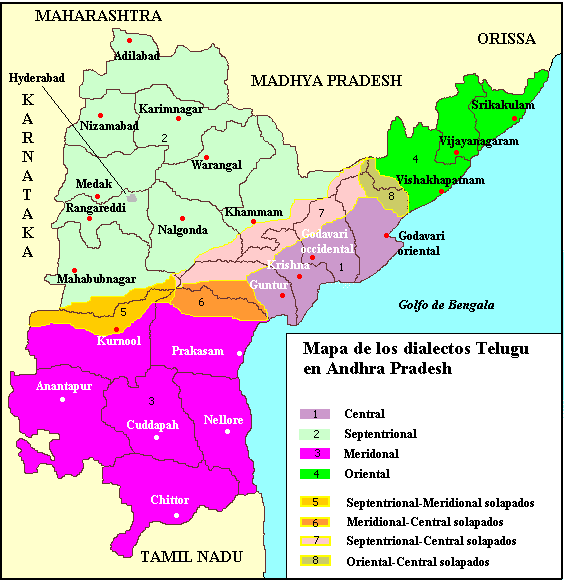 El telugu moderno tiene cuatro dilectos regionales: septentrional (en