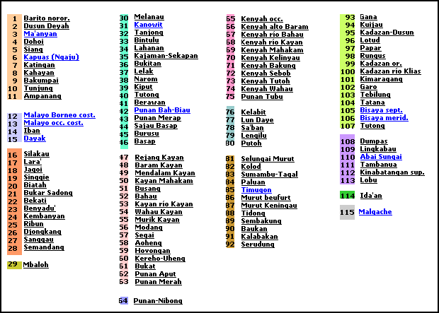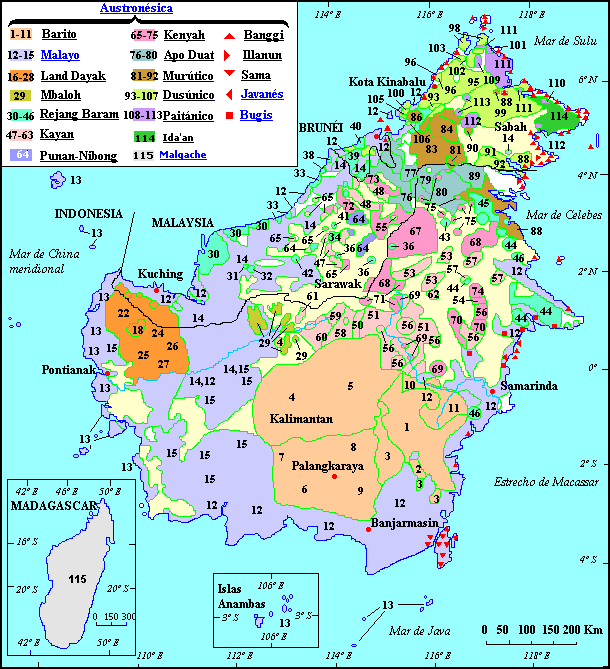 En el norte de Borneo (Sarawak, Sabah y Brunéi) el malayo es la lengua nacional y lingua franca, aunque también está presente el bazar malayo, si bien en retroceso. Las otras lenguas sólo tienen importancia local, salvo algunas de las lenguas kayan-kenyah, los grupos rejang-baram y los dialectos iban que tienen un papel como lenguas de amplia comunicación.