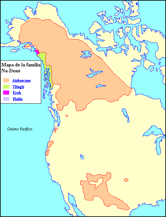 y más estrecha va a lo largo de la costa del Pacífico desde Oregón a California. La existencia de la familia na-dené, que incluye