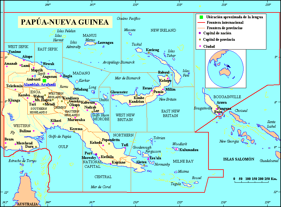 El pidgin de comercio alamblak-arafundi se habla en Papúa-Nueva Guinea, en la provincia Sepik oriental, en los cursos bajo y medio de los ríos Karawari y Arafundi, respectivamente. Las consultas hechas en Yimas sobre otros pidgins de comercio revelan que se usó entre los hablantes de arafundi de la localidad de Auwim y los de alamblak en la localidad de Chimbut. Se desconoce si la lengua está moribunda o ya se ha extinguido.