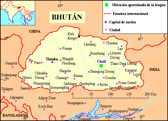 La lengua chali se habla al norte de la zona de Monggar en Bhután, al este del río Kurichu. Cuenta con unos 1.000 hablantes y está amenazada.